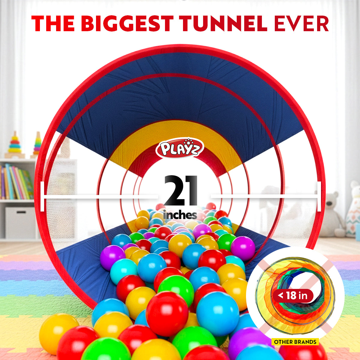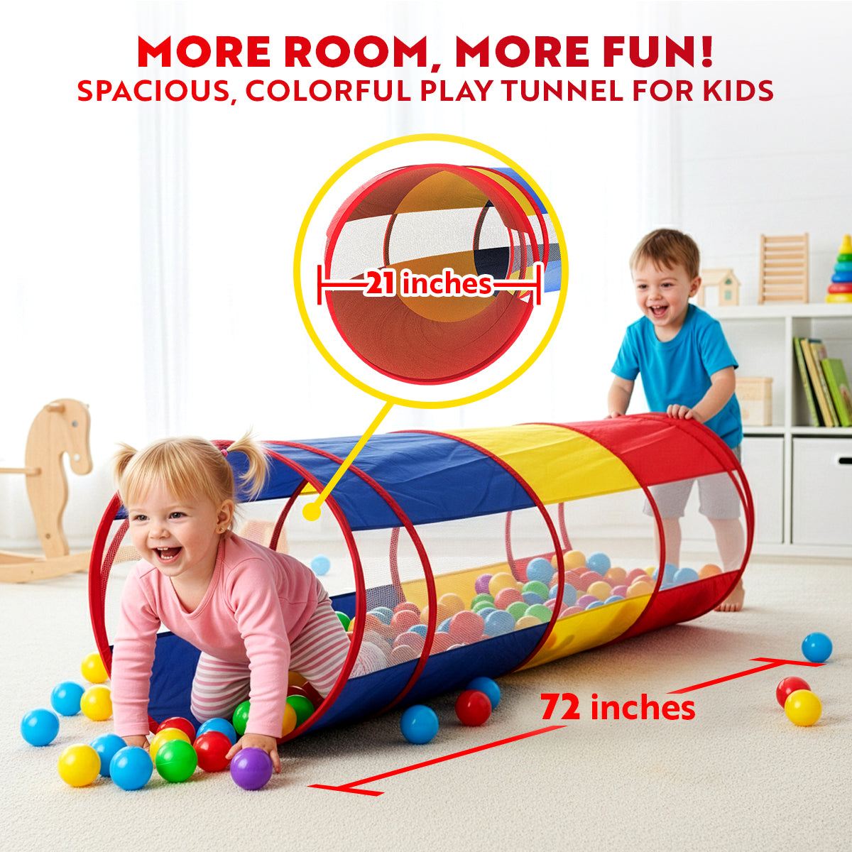 - CHASE THE FUN and join the colorful crawl of fame! Embark on a transformative tunnel adventure that promotes physical development, fuels imagination, enhances social skills, and stimulates cognitive growth through play. Our crawl tunnel for toddlers 1-3 and up is a gem among all play tunnels for kids that is built to withstand energetic crawling and toddler active play, ensuring longevity. (BALL PIT BALLS NOT INCLUDED)