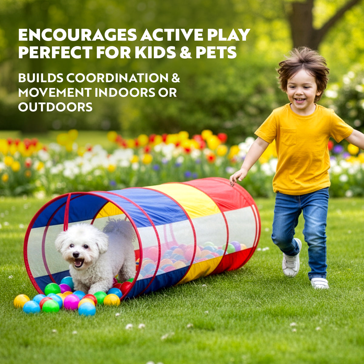 - KIDS LOVE IT! DOGS LOVE IT! CATS LOVE IT! This kids and pet tunnels is the ultimate indoor and outdoor playtime wonder where everyone in the family, from kids to our furry friends, finds their own kind of joy. This dog tunnel for large dogs, medium dogs, small dogs, and puppy makes a great agility toy. Kitty cats can't also resist this long and large cat tunnel bed, a purrfect cozy cat tube haven to stretch and snooze in style.