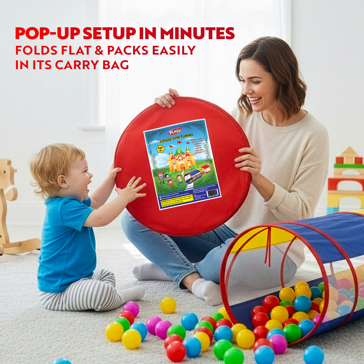 - EASY STORAGE AND PORTABILITY Watch as this fold up play tunnel for toddlers 1-3 and big kids pops open in seconds and folds away with ease when playtime is over, thanks to its smart design! The included storage bag makes it a breeze to carry wherever adventure calls. Indulge in baby tunnel crawl indoor fun! Perfect collapsible kids tunnel for toddlers and baby crawling tunnel for playrooms, plus outdoor playdate at parks, camps, or at your own sunny backyard.