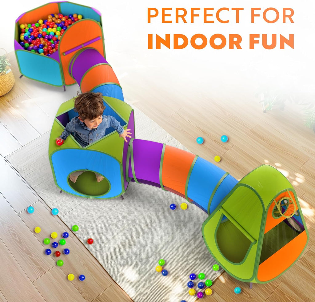 - ★ ENHANCED ONE-OF-A-KIND DESIGN ★ The teepee tent features 5 mesh net holes and a basketball hoop with a cool ball return funnel that allows children to play a variety of cool games. The closable ball pit tunnel opening allows it to be used as a separate ball pool and will hold 200 balls or over 1000 balls. Our colorful double mesh tunnel has a flexible structure with padded steel wire. The cube tent features 4-way access and connection capability for making different combinations of tents.