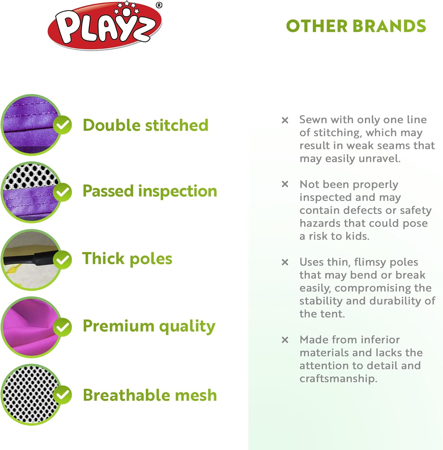 - ★ BABY CERTIFIED ★ We were inspired by dozens of little kids opinions which led to our innovative child-friendly design. Soft thick fabric, breathable mesh walls, and flexible padded structure gives your child the safest enjoyable experience. Our special ground anchor loops allow the tents to be secured outside on a windy day. Playz toys always meet & exceed all USA CPSC Toy Safety Guidelines.
