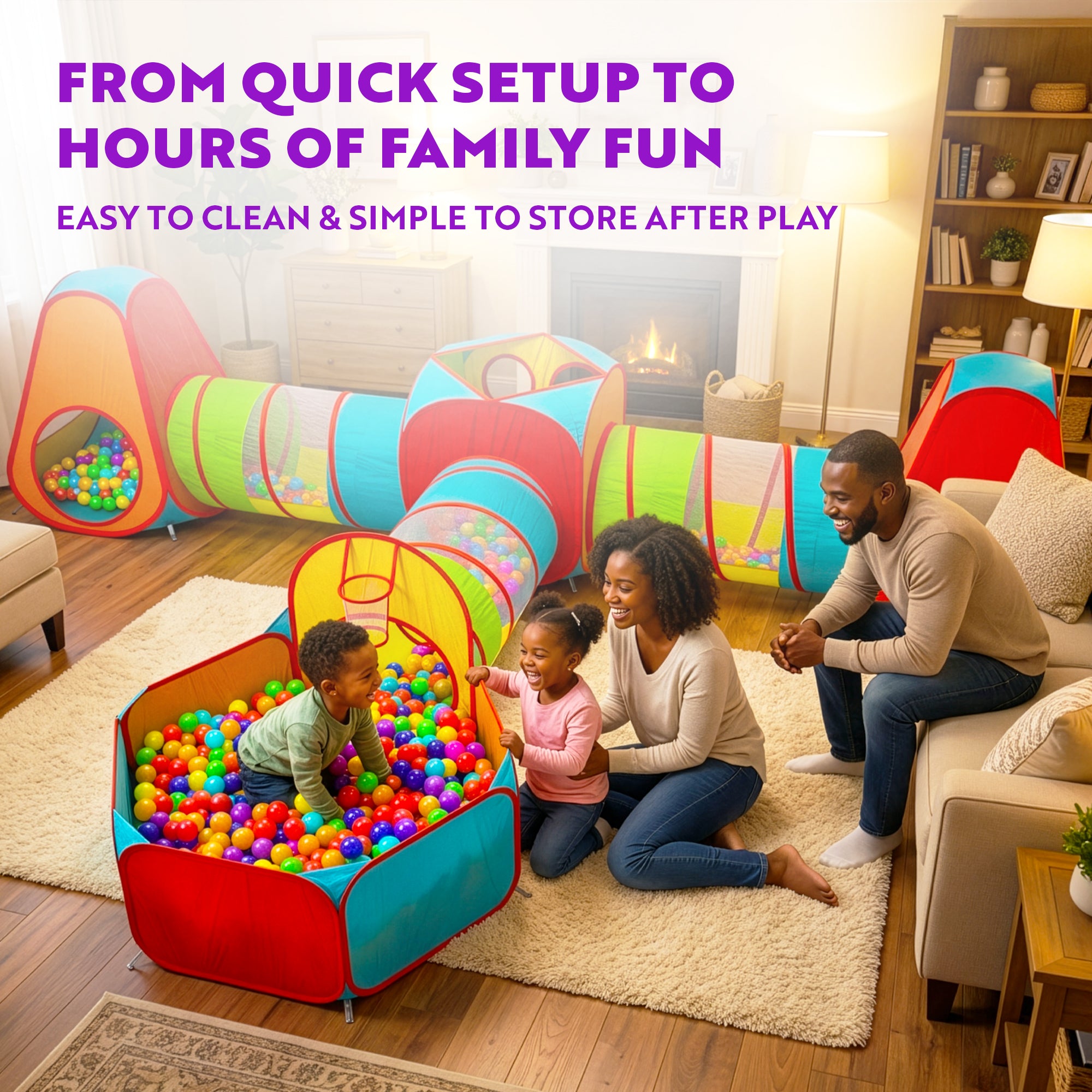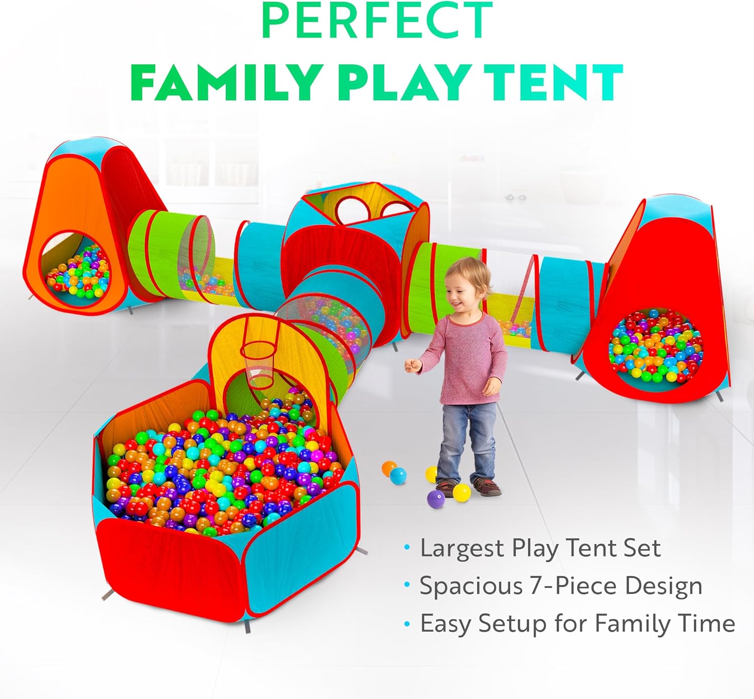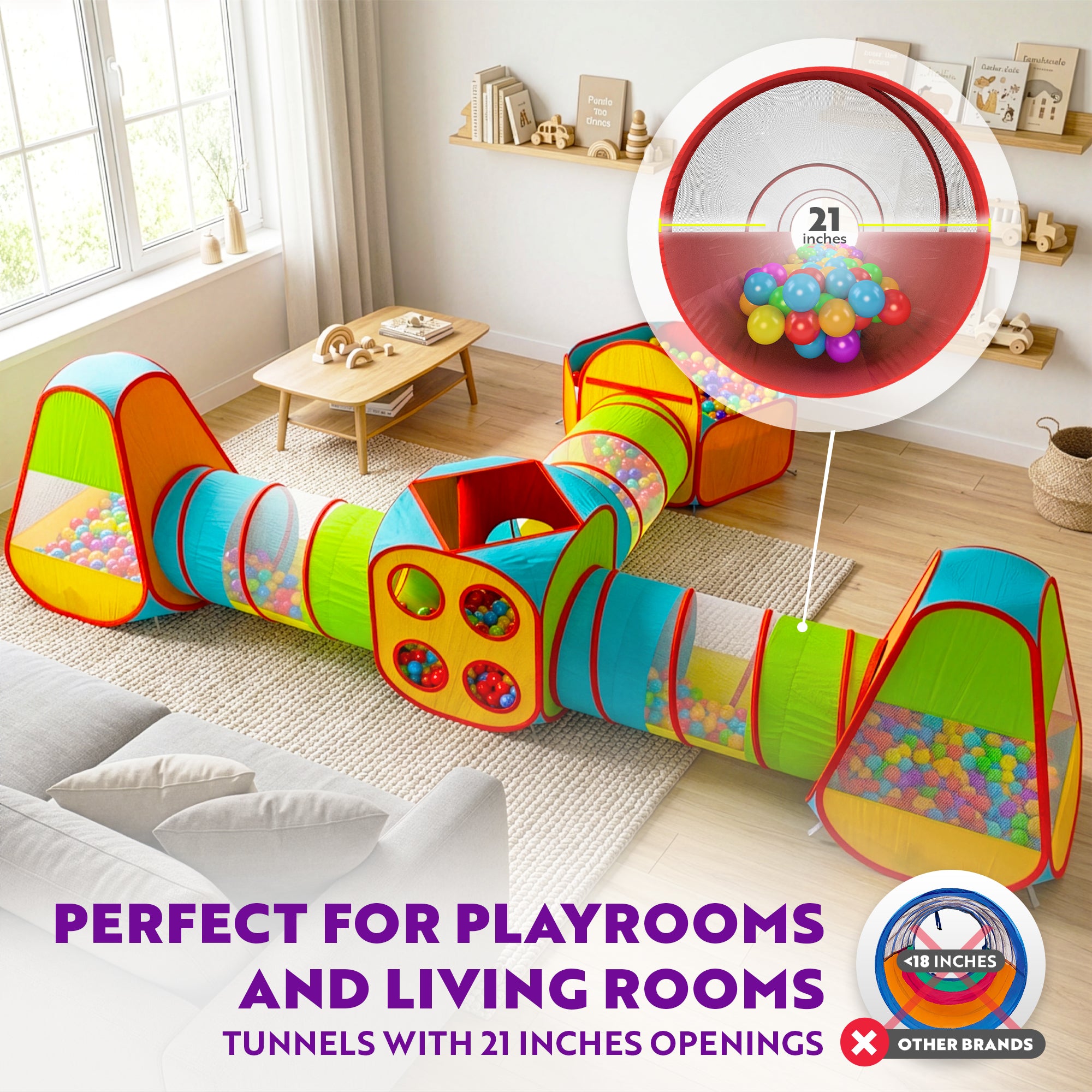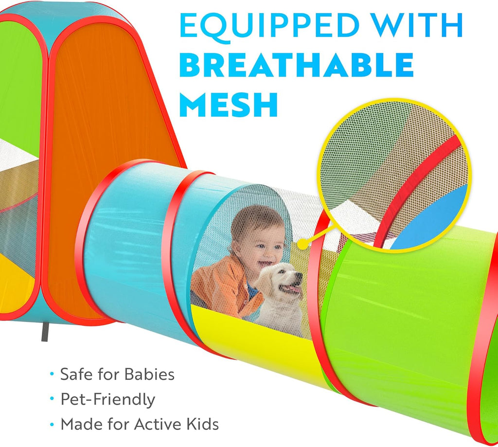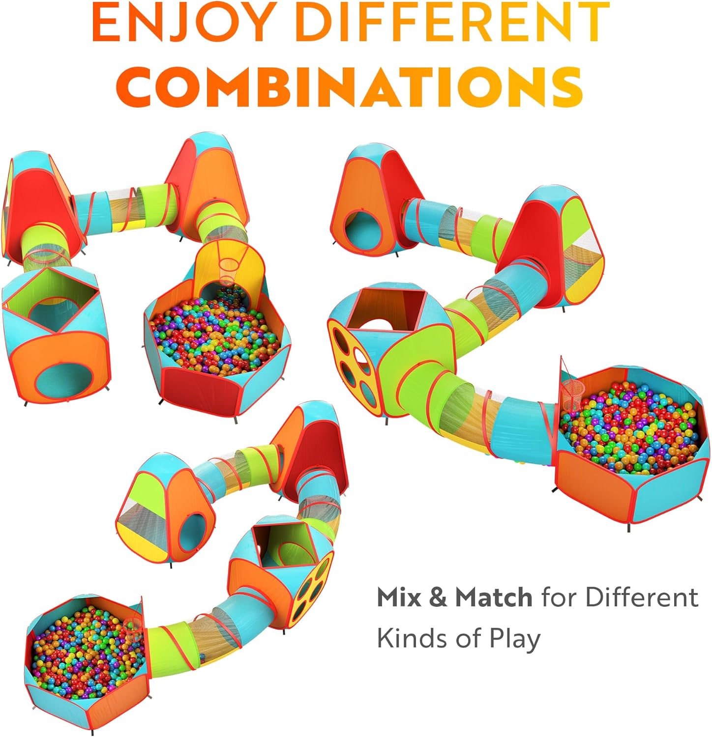 - SIMPLE & STURDY ★ Portable, durable, easy to setup & foldable, a lightweight zipper carrying bag for convenient storage. With 3 tunnels, 2 teepee tents, 1 box tent, and 1 ball pit, you can use this play set in dozens of different combinations. ** PLAY PIT BALLS NOT INCLUDED **