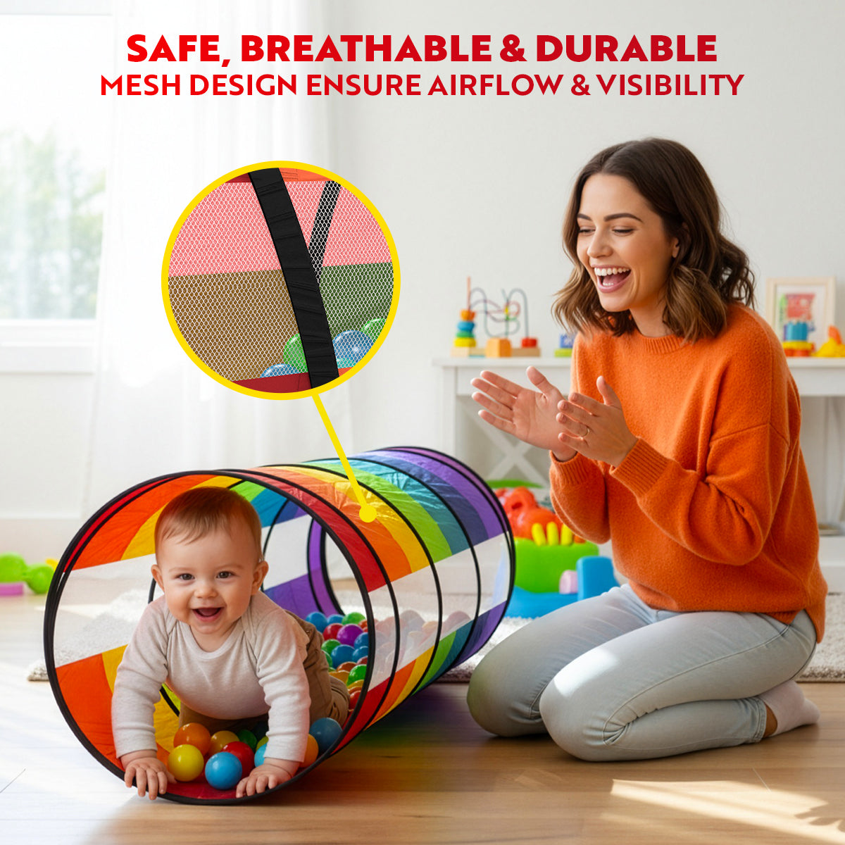 - Safe for 12+ Months – Unlike competitors rated for 36+ months, this baby tunnel is tested safe for infants as young as 12 months. Made from breathable, tear-resistant fabric, ensuring a safe crawling experience.