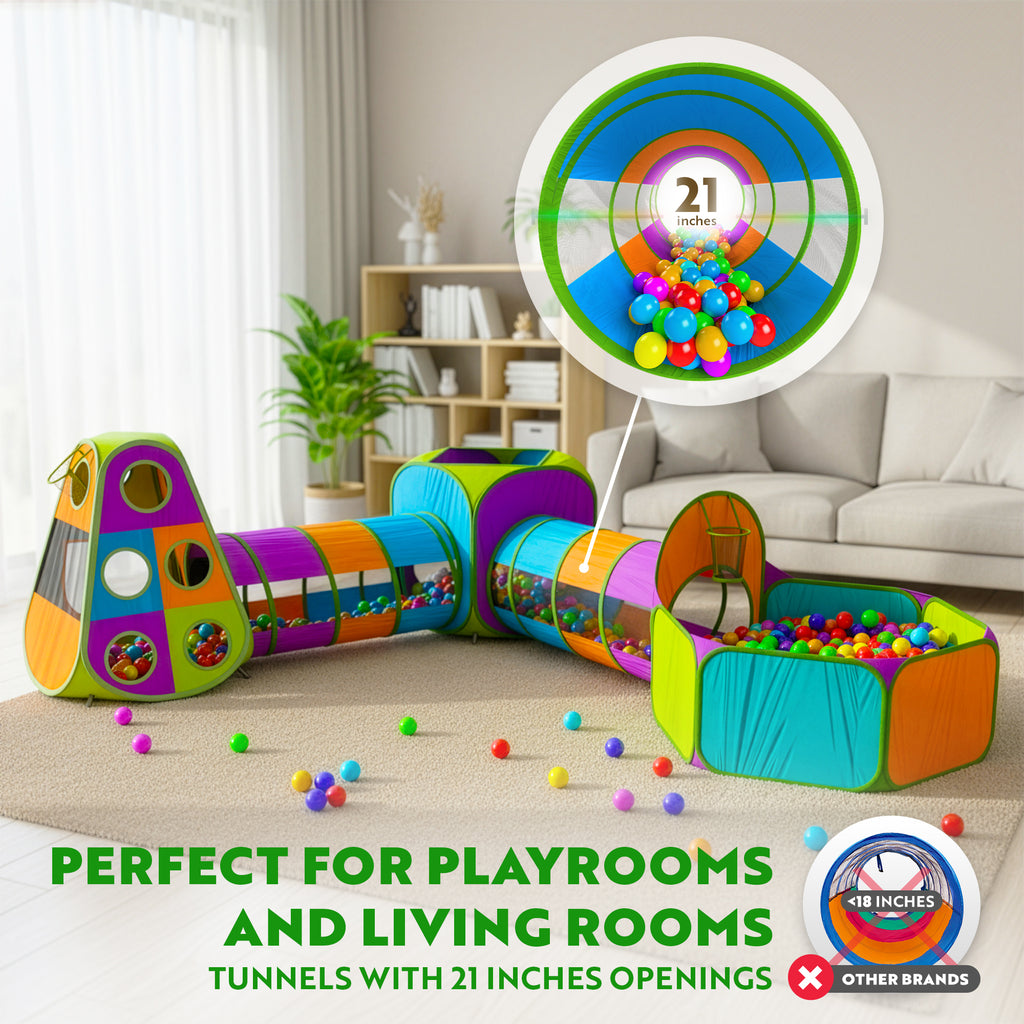 - ★ ENHANCED ONE-OF-A-KIND DESIGN ★ The teepee tent features 5 mesh net holes and a basketball hoop with a cool ball return funnel that allows children to play a variety of cool games. The closable ball pit tunnel opening allows it to be used as a separate ball pool and will hold 200 balls or over 1000 balls. Our colorful double mesh tunnel has a flexible structure with padded steel wire. The cube tent features 4-way access and connection capability for making different combinations of tents.