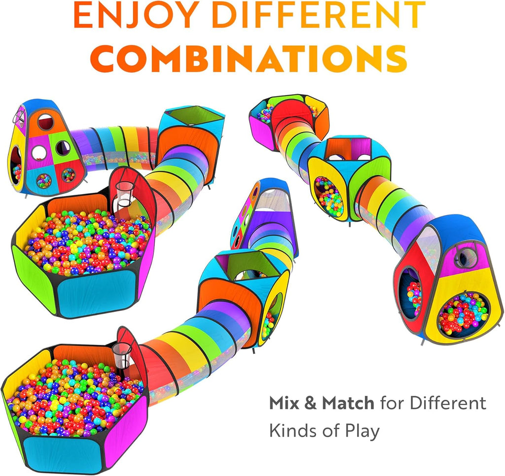- RAINBOW WONDERLAND - This 5-piece premium Rainbow indoor & outdoor pop up playhouse includes spacious kids play tents, large kids ball pit with basketball hoop, 21-inch opening interactive crawl tunnels obstacle course, and accessories that will keep children entertained for hours. Kids can enjoy an array of colors and endless possibilities by customizing tent and tunnel configurations! A must-have toy for any active kid, toddler, baby, cats & dogs, and even adults.
